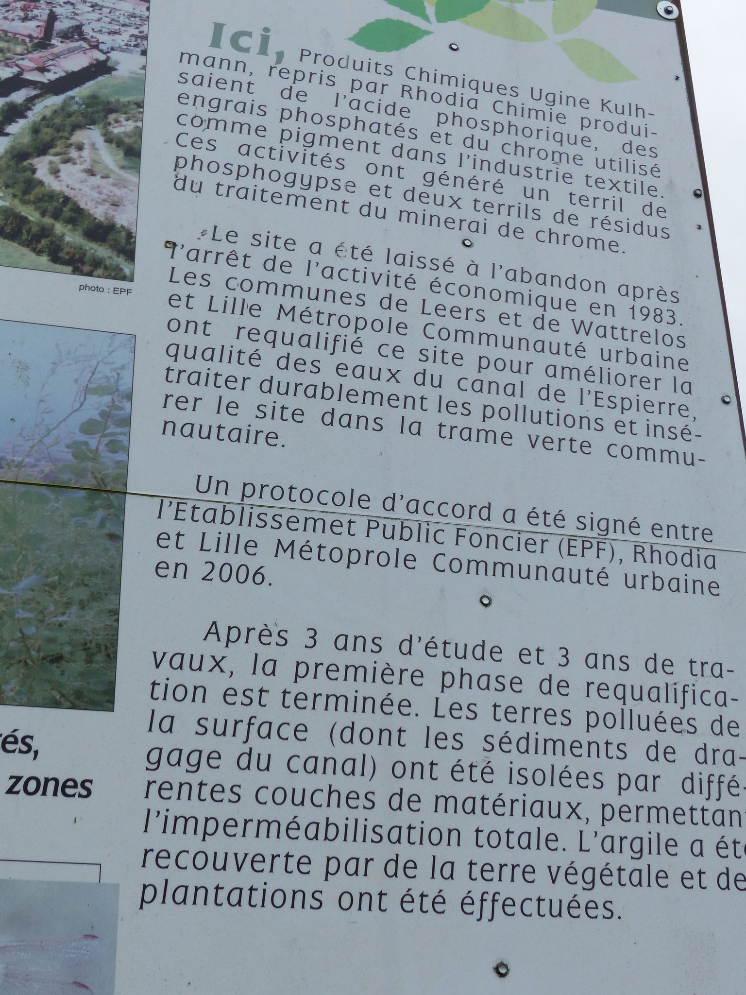 Dans les années 2000's, parallèlement au projet d'aménagement du canal de Roubaix; il faut trouver une solution pour récupérer un sol propre et sain, et ainsi mettre à disposition de tous, un Espace Naturel Métropolitain. S'écoule trois ans de réflexion puis advient la phase opérationnelle. Premièrement il faut confiner les zones contaminées pour contenir et limiter la pollution vers l'extérieur. Conjointement, des aménagements de nettoyage et un outil de contrôle surveille le sol; résultat: une baisse significative du niveau de Chrome est remarqué, ce qui prouve de l'efficacité du confinement en place. Actuellement, les impacts de pollution du site vers l'extérieur ne cesse d'être limité.